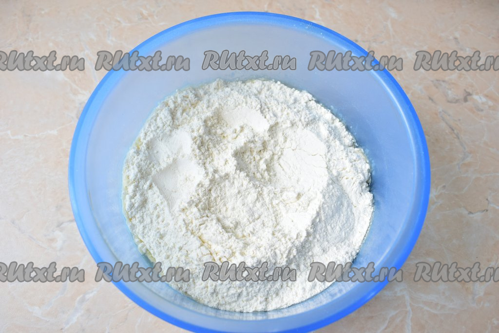 Муку просейте через сито, чтобы наполнить её кислородом. В смесь масла и горячей воды всыпьте муку, добавьте по щепотке соли и соды, перемешайте вначале ложкой, а затем продолжайте замешивать руками.