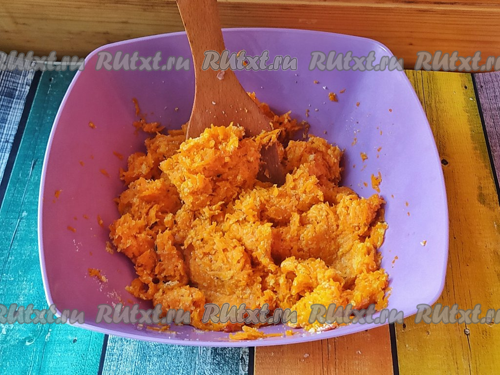 Морковная масса получится густой, по консистенции будет напоминать фарш для традиционных мясных котлет.
