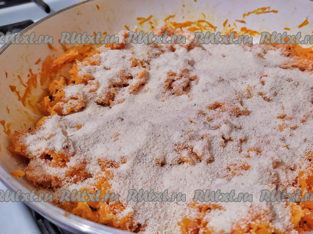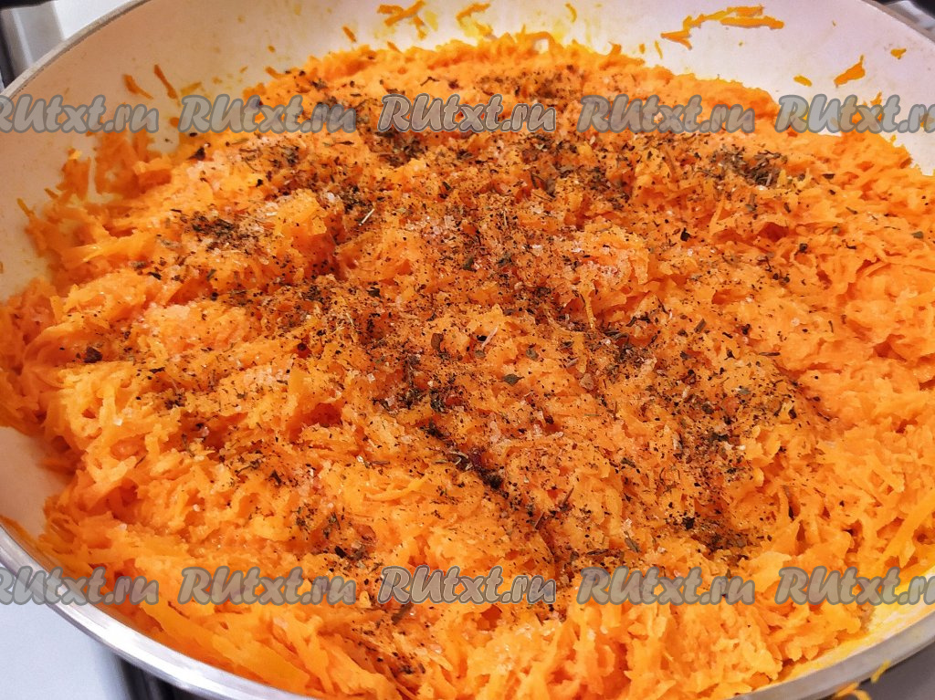 Выложить морковную массу в сковороду, залить молоком, посолить, добавить любимые специи (у меня специи для мяса) и поставить тушиться на минимальный огонь под закрытой крышкой на 15 минут, периодически помешивая. За это время морковка пустит сок и станет мягкой.