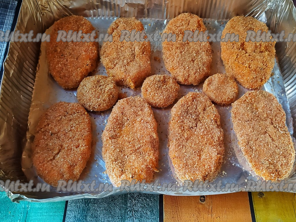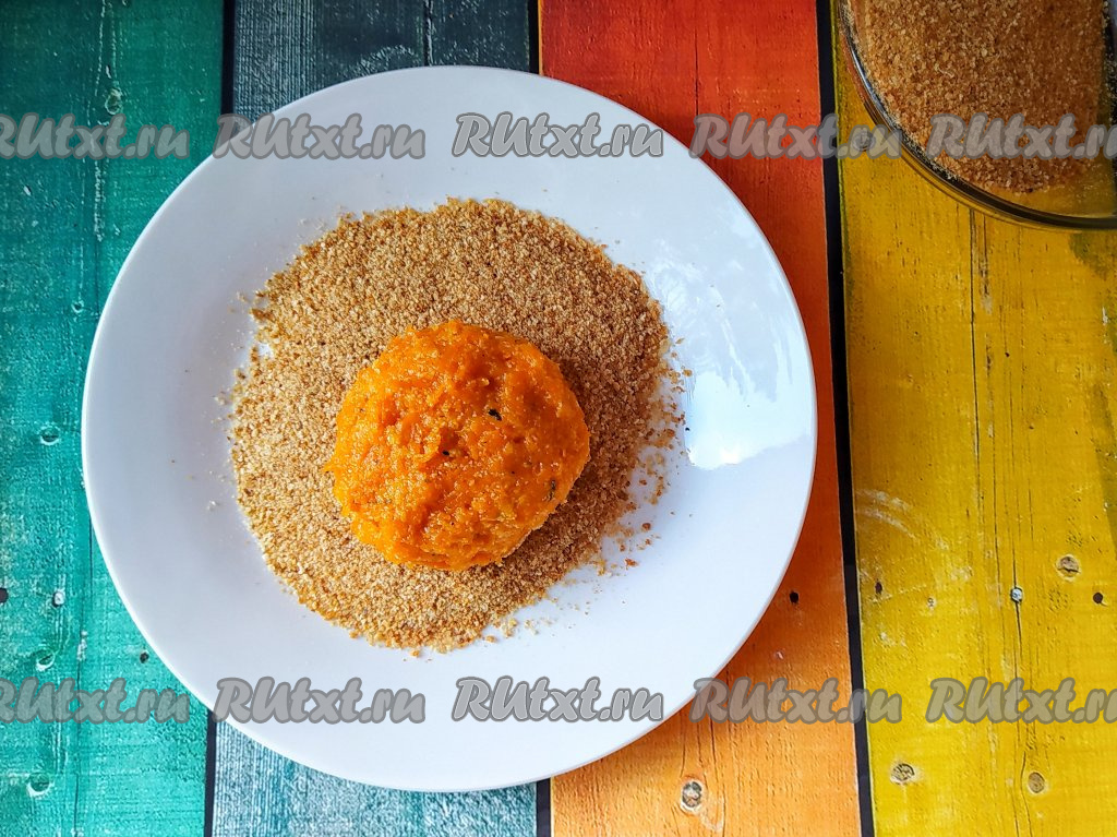 Сформировать морковные котлетки и обвалять каждую в панировочных сухарях со всех сторон.