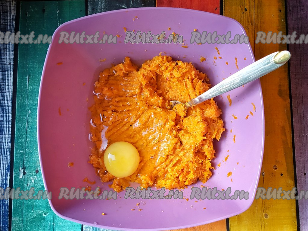 В остывшую смесь моркови и манки вбить яйцо, перемешать.