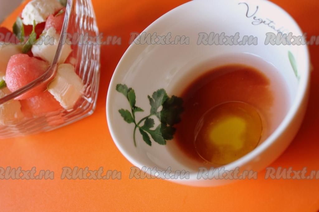 Приготовьте заправку: оливковое масло соедините с бальзамиком и арбузным соком, который выделился при нарезании (около 3-4 столовых ложек) и перемешайте.
