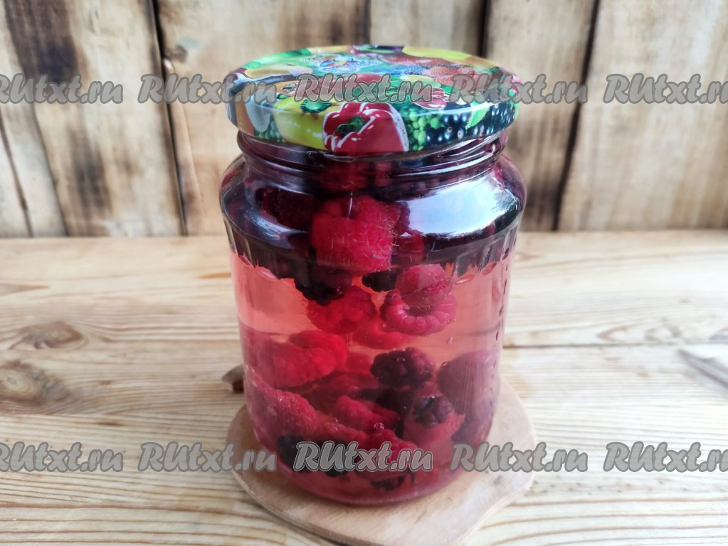 Довести сироп до кипения, проварить 1-2 минуты и вылить в банку с ягодами, герметично закрыть крышкой. Перевернуть банку с компотом дном вверх, укутать в тёплый плед (или в одеяло) и оставить в таком виде до полного остывания. Затем отправить компот на хранение (эту заготовку можно хранить при комнатной температуре). Компот из ежевики и малины получается рубинового цвета, средне-сладким, с великолепным ароматом жаркого лета. Этот напиток идеально утолит жажду в холодный зимний день!