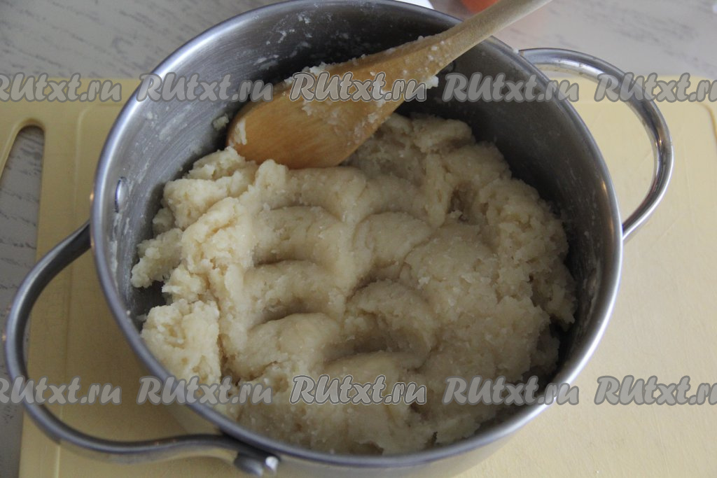 Тщательно перемешивать тесто лопаткой до получения однородной массы. Заваривать тесто, хорошо перемешивая, в течение 1 минуты (тесто должно отходить от стенок кастрюли), убрать с огня. Тесто получится эластичным и без следов сухой муки.