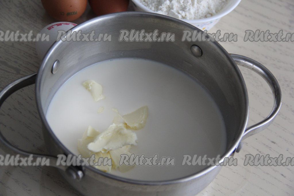 В кастрюлю влить молоко, добавить сливочное масло, нарезанное на кусочки, всыпать сахар, ванильный сахар и соль.