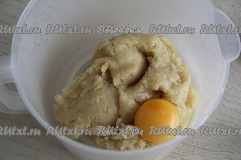 Переложить тесто в чашу для взбивания, остудить в течение минут 10. Затем добавлять в тёплое заварное тесто по одному яйцу, каждый раз тщательно перемешивая миксером до полного растворения яиц в тесте.
