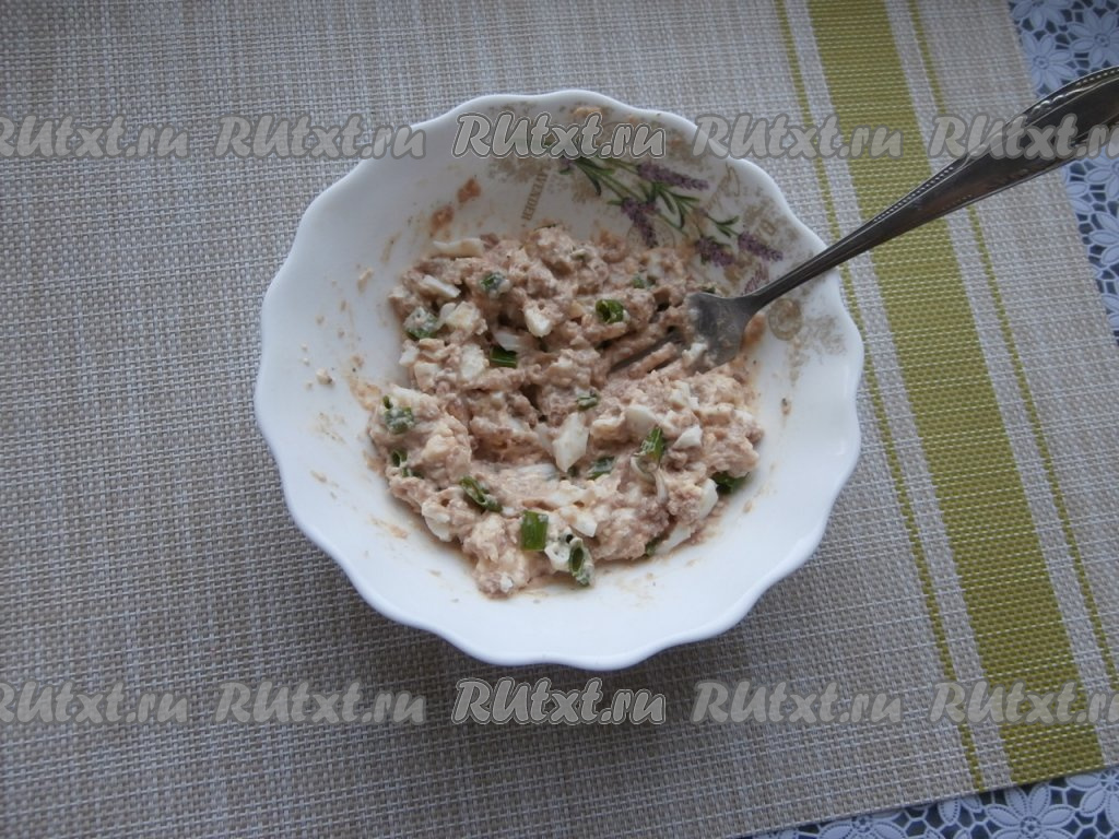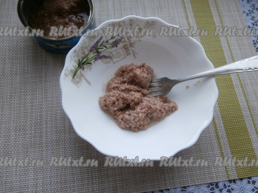 Примерно, 50 грамм консервированного тунца из банки переложить в миску, масло слить и размять вилкой (у меня был салатный консервированный тунец, уже измельчённый).