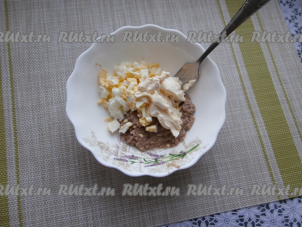 Сюда же добавить измельчённый чеснок, нарезанный зелёный лук, чёрный молотый перец, тщательно перемешать, если нужно, подсолить и намазка для бутербродов готова.