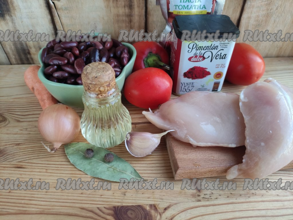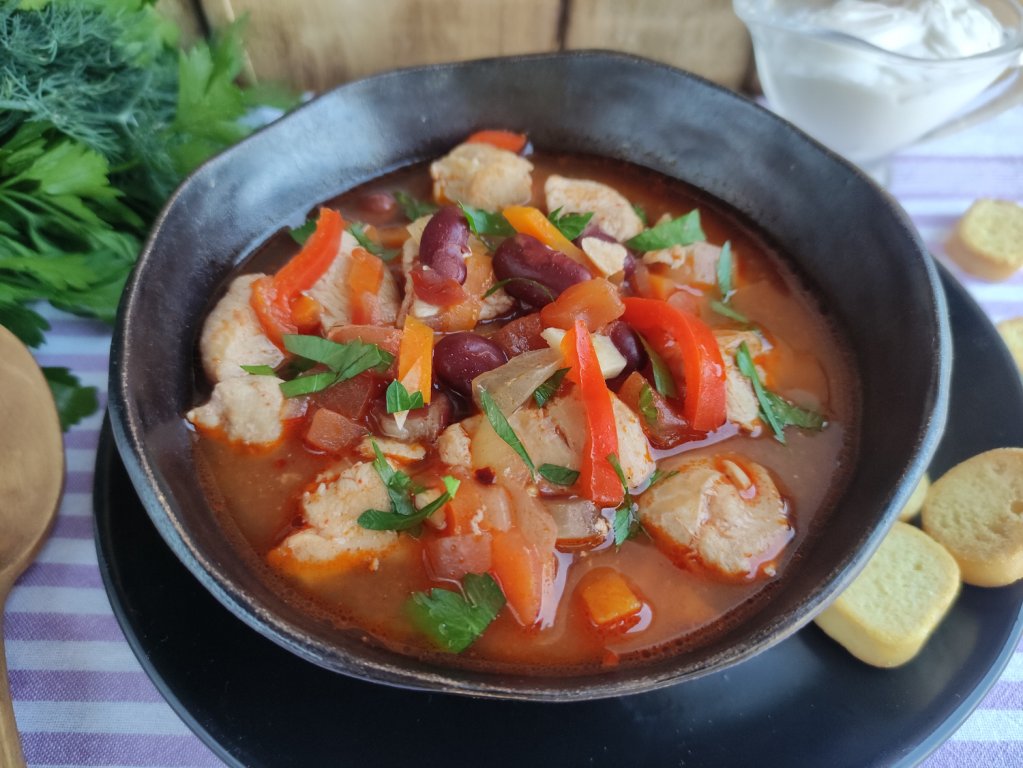 Густой домашний томатный суп с фасолью и курицей сварить достаточно просто, а получается он сытным и ароматным, с насыщенным мясным вкусом. Блюдо готовится непривычным способом. Вначале кусочки курицы и овощи обжариваются, тушатся в томате с фасолью и специями. А после суп разводится кипятком до желаемой густоты. Для приготовления супа потребуется толстостенная кастрюля (лучше всего с антипригарным покрытием) или сотейник. Для этого рецепта можно использовать консервированную или предварительно отваренную фасоль. Томатный фасолевый суп внесёт приятное разнообразие в повседневное меню и порадует отменным вкусом и вас, и ваших близких!