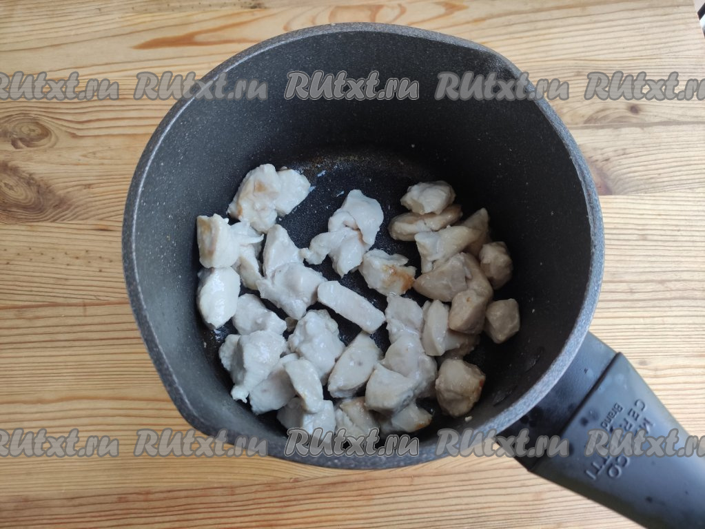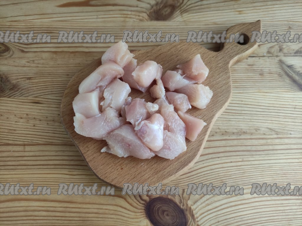 Вымыть куриное филе, немного обсушить и нарезать на кубики с размером стороны 1,5 см.