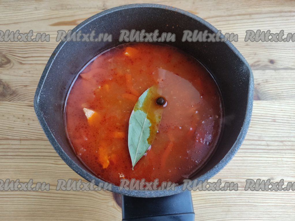 Затем суп посолить, поперчить, добавить чеснок, душистый перец, паприку и лавровый лист, проварить 3 минуты, выключить огонь, накрыть кастрюлю крышкой и оставить настояться минут на 10.