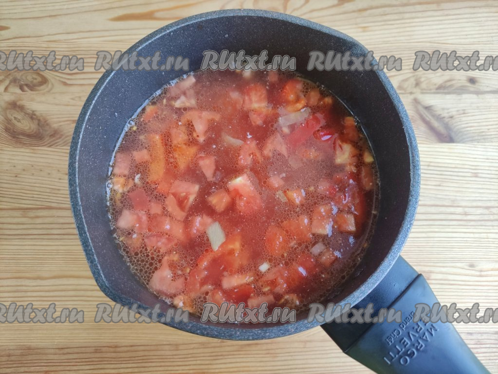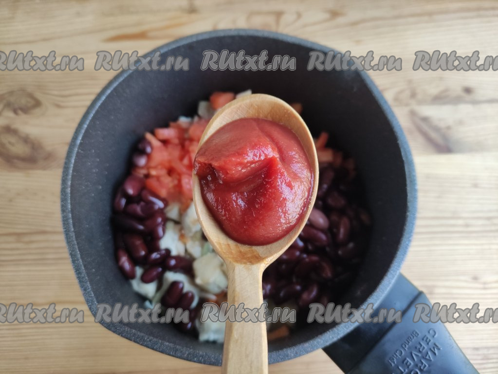 После этого развести содержимое кастрюли кипятком до желаемой густоты, дать закипеть. Продолжать варить томатный суп с фасолью и курицей на небольшом огне 10 минут.