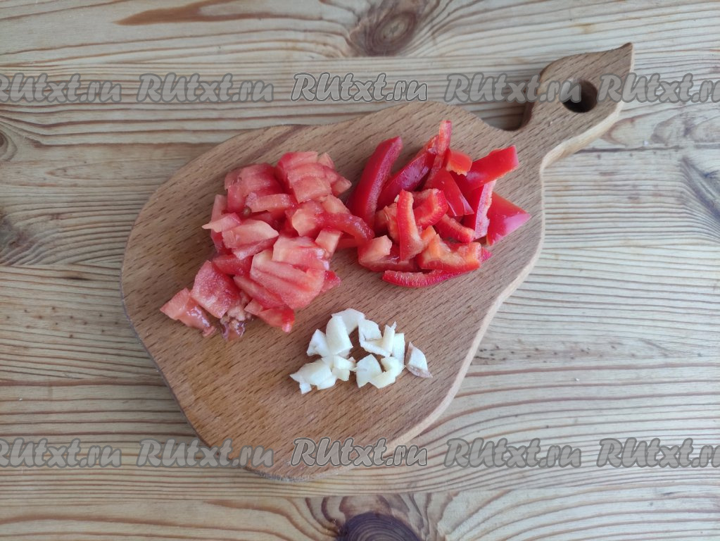 С помидоров снять кожицу, болгарский перец очистить от семян, с чеснока удалить шелуху, промыть овощи. Чеснок нарезать на тонкие пластины, а помидоры и перец - брусочками.