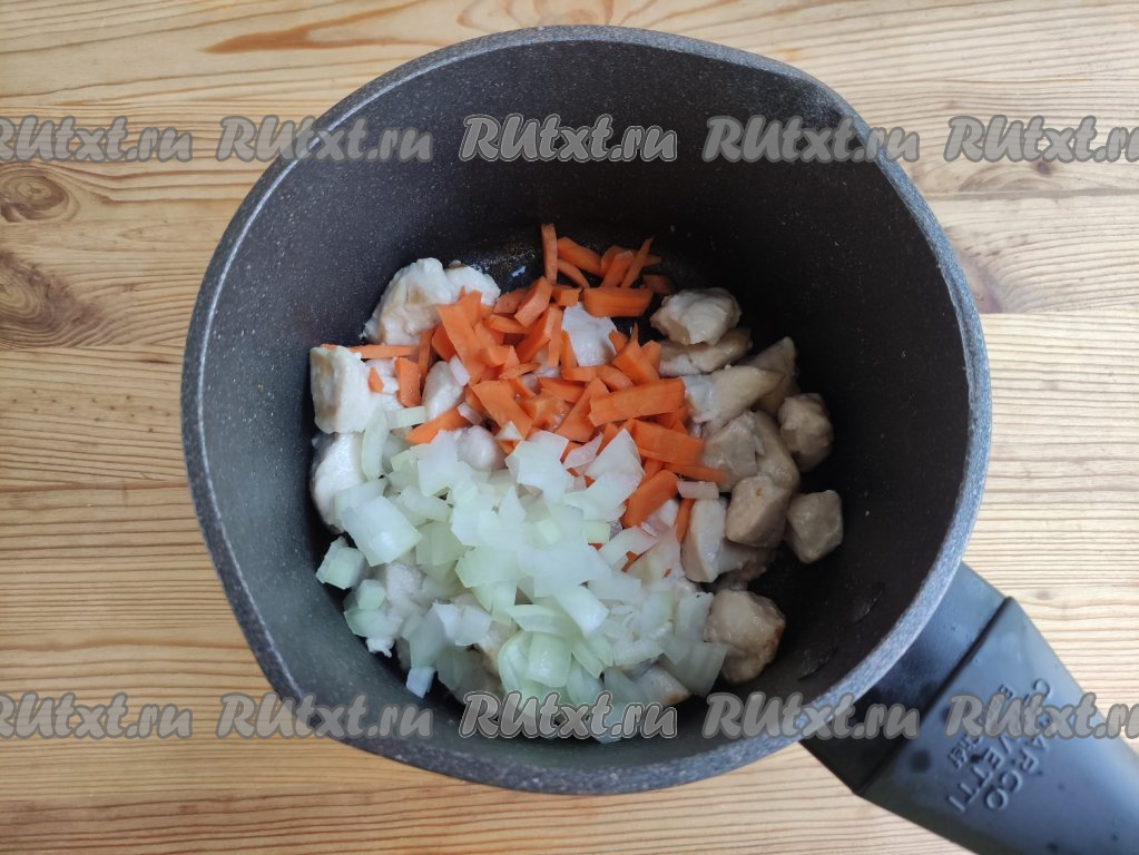 Когда мясо покроется золотистой корочкой, выложить к нему лук и морковь, обжаривать, не забывая перемешивать, минут 7-8 (до прозрачности овощей).
