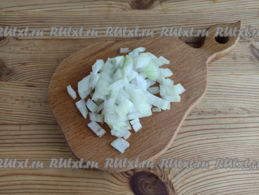 Лук очистить от шелухи, нарезать кубиками.
