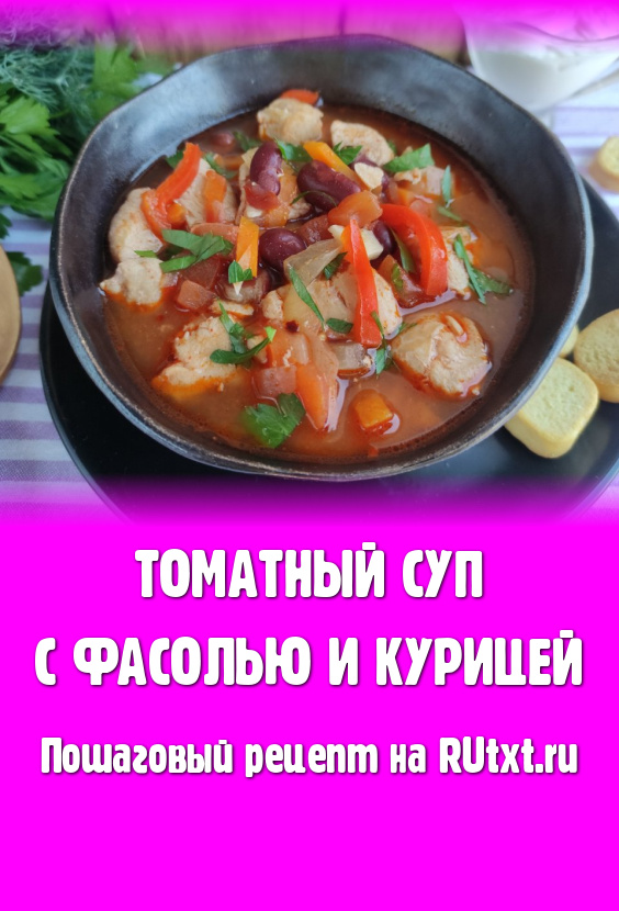Густой, насыщенный, ароматный томатный суп с курицей и фасолью разлить по тарелкам и сразу подать к столу, посыпав мелко нарезанной петрушкой (или другой зеленью) и дополнив, по желанию, сухариками или гренками.