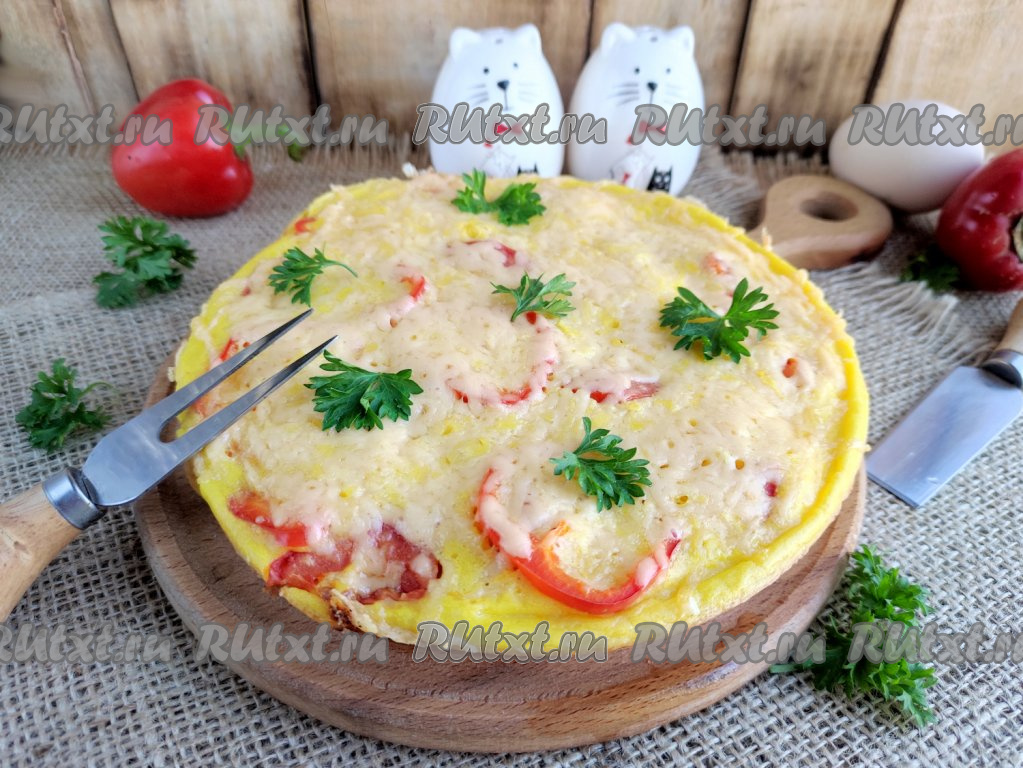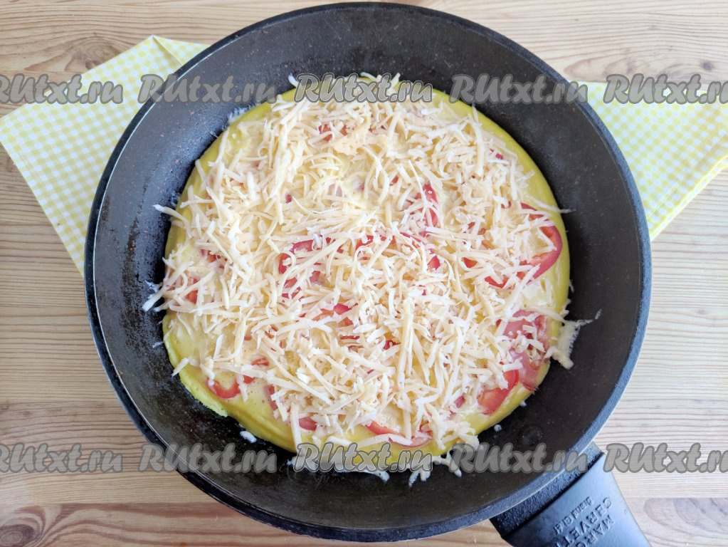 Болгарский перец очистить от внутренностей и семян, нарезать его колечками толщиной 5 мм и выложить рядом с помидорами. Накрыть сковороду крышкой, поставить на средний огонь и готовить ленивую пиццу в течение минут 8.