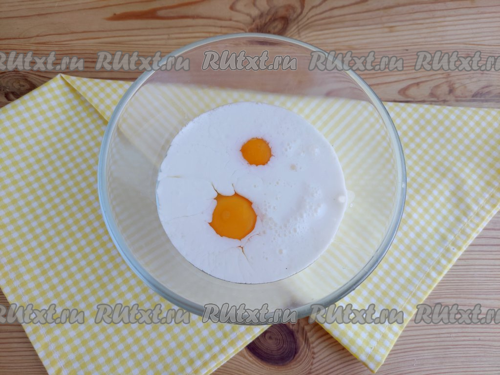 Кефир влить в достаточно глубокую миску, добавить сырые яйца, всыпать соль по вкусу, перемешать венчиком до однородности.