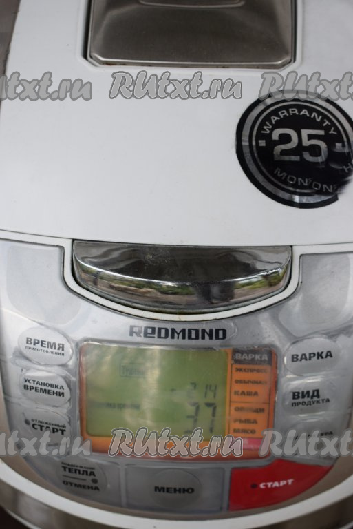 Далее выбираем режим приготовления. Во многих мультиварках Редмонд есть режим "Каша" или "Молочная каша", в моей мультиварке этот режим длится 10 минут и, конечно же, для варки рисовой каши с тыквой этого времени будет недостаточно. Также можно выбрать режим "Варка", но, на мой взгляд, он более агрессивный и жидкость выкипает на режиме "Варка" быстрее, чем нужно для каши. Поэтому я готовлю так: выбираю режим "Тушение", который длится 1 час, на этом режиме каша хорошо разварится, пропарится и получится очень мягкой и вкусной. Нажимаем кнопку меню несколько раз, пока не начнёт мигать программа "Тушение" и нажимаем "Старт". Крышку мультиварки не открываем, пока половина времени не пройдёт.