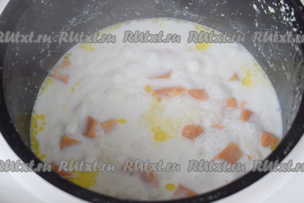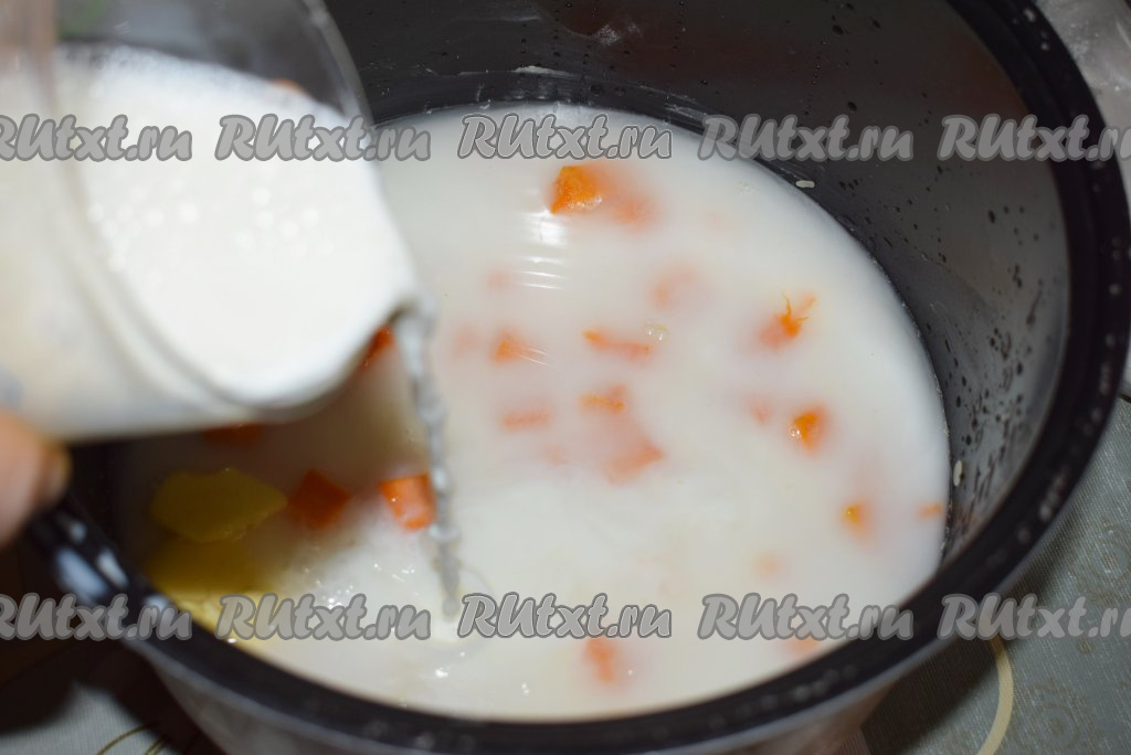 Вливаем в чашу мультиварки воду и молоко, крышку закрываем.