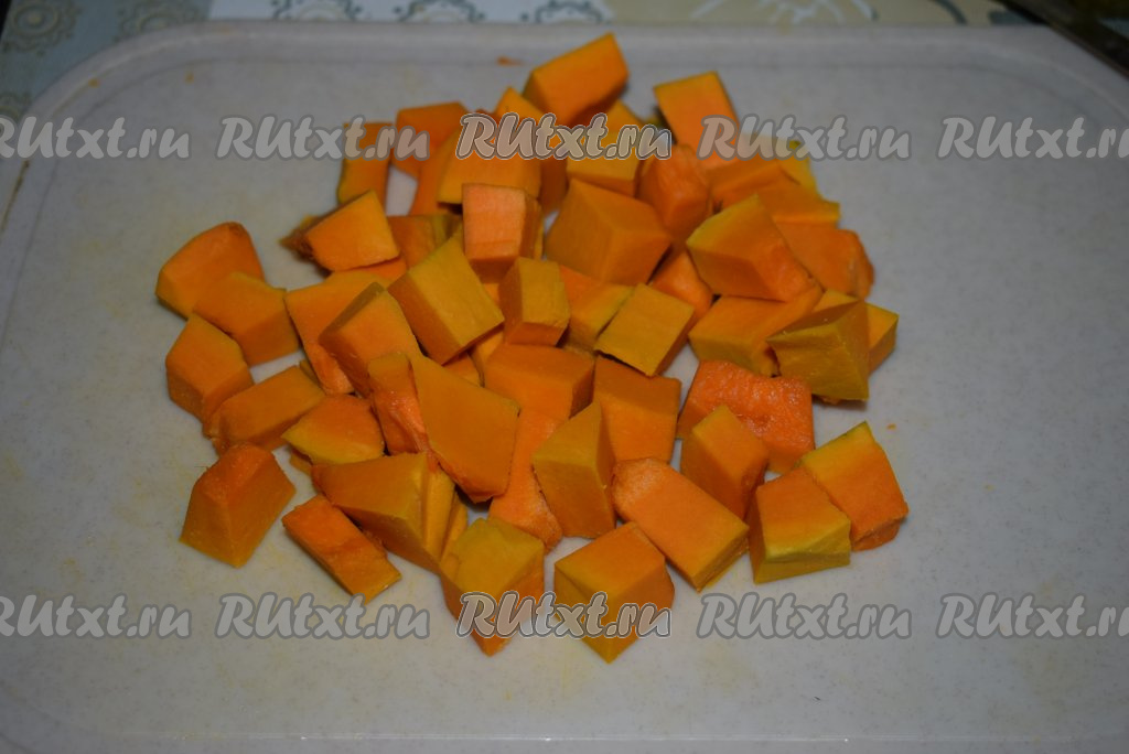 Для начала нарежем тыкву на дольки, очистим их от кожуры и семечек. 160 грамм очищенной тыквы нарежем на небольшие кубики.