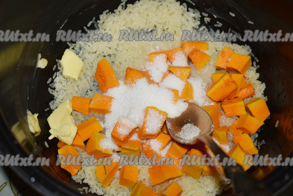Далее на рис выкладываем нарезанную тыкву. Добавляем сахар, соль и сливочное масло.