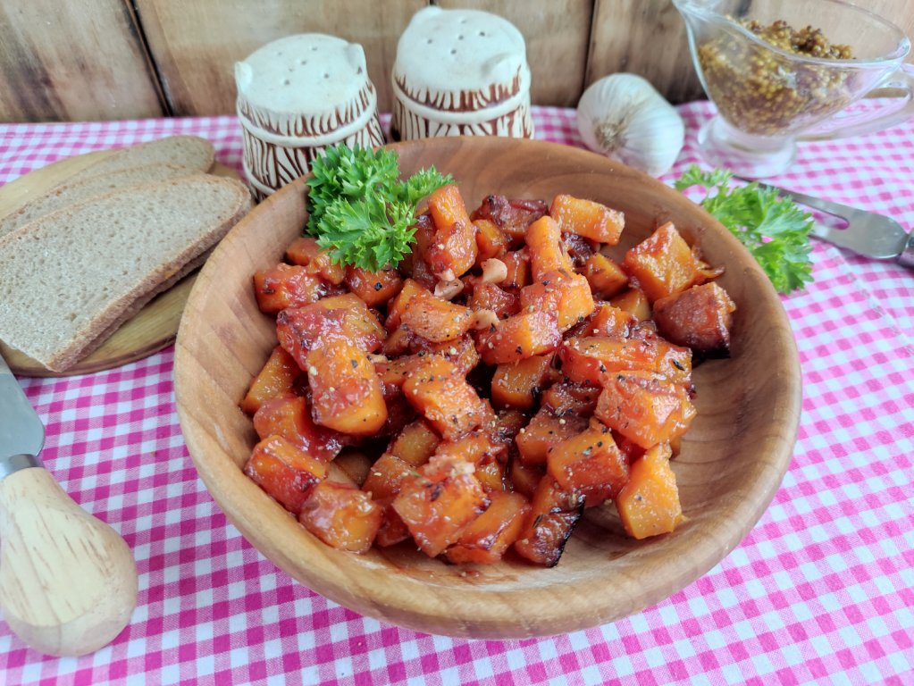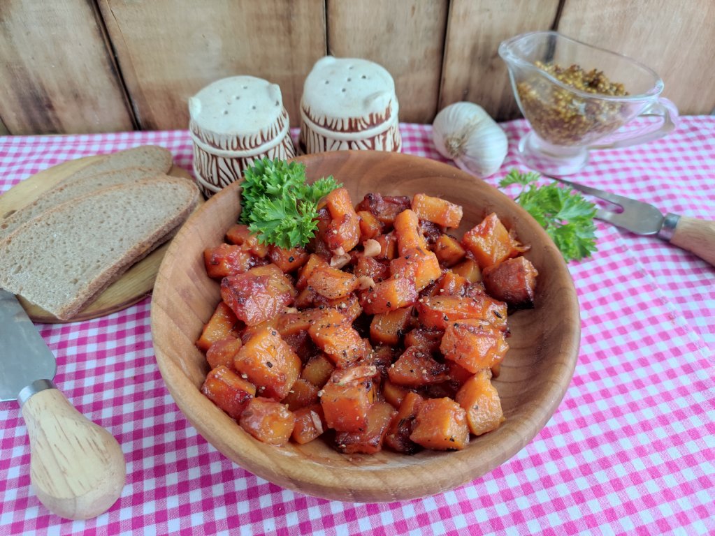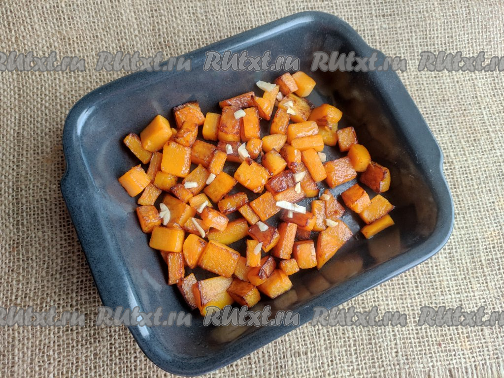Посыпать тыкву очищенным и мелко нарезанным зубчиком чеснока.