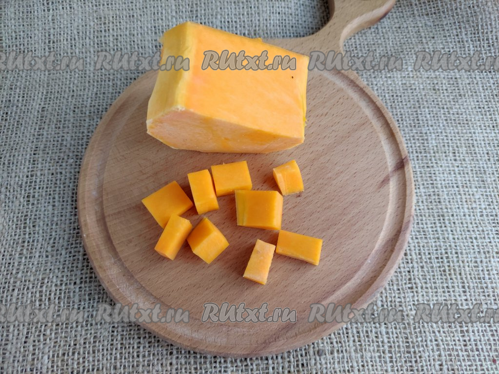 300 грамм тыквы, очищенной от семечек и кожуры, нарезать на кубики с размером стороны около 1 см.