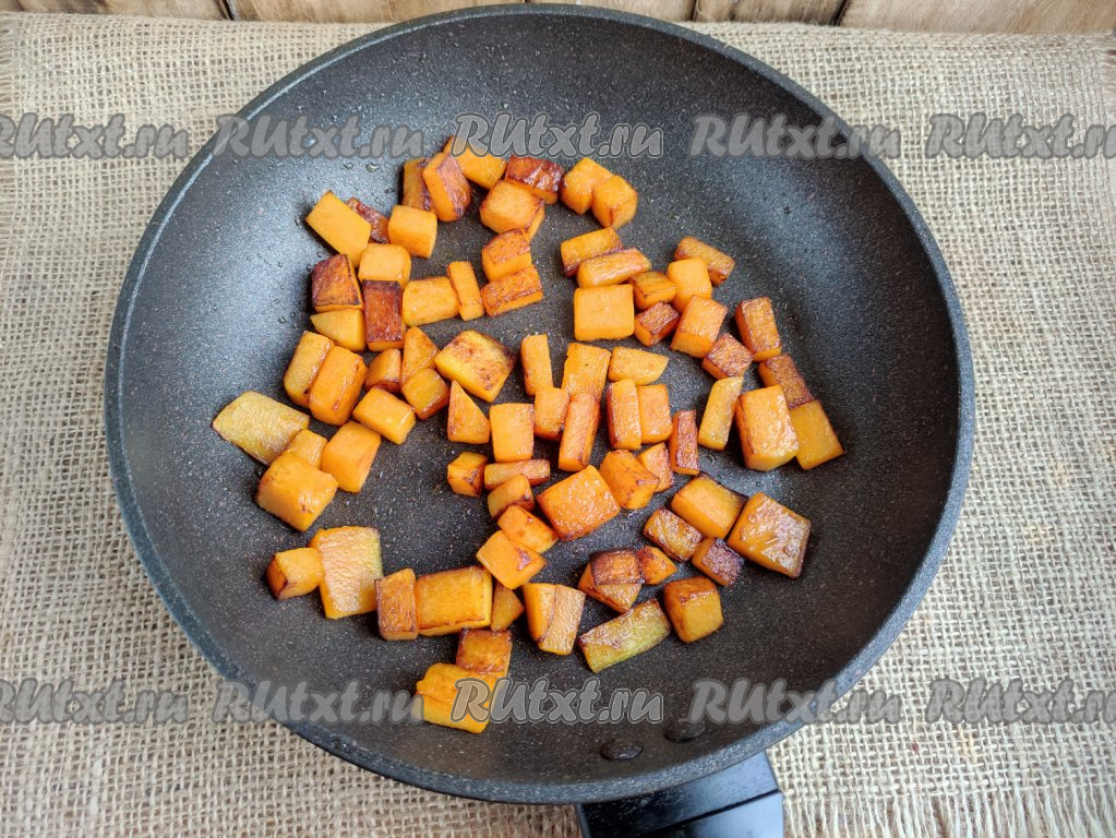 Разогреть в сковороде 1,5 столовые ложки растительного масла, выложить нарезанную тыкву. Лучше всего взять достаточно большую сковороду (например, диаметром 22-24 см), чтобы выложить кусочки тыквы в один слой. Обжарить тыкву на среднем огне до румяной корочки со всех сторон, периодически перемешивая.