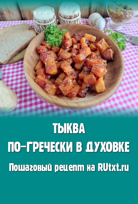 Томатную пасту смешать с водой, а затем вылить в форму с тыквой. Накрыть форму фольгой и готовить тыкву по-гречески в духовке, разогретой до 180 градусов, в течение 15 минут. За это время тыква станет мягкой. Можно дополнительно подрумянить кусочки, открыв фольгу и подержав блюдо в духовке ещё 3 минуты.