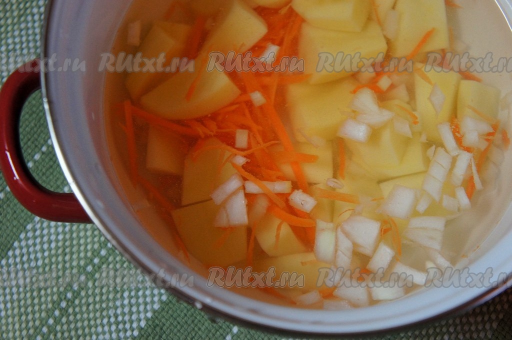 Картофель крупно нарезать и тщательно промыть. В кастрюлю налить 1,5 литра воды, когда вода закипит, уменьшить огонь, добавить мелко нарезанный лук, натёртую на тёрке морковь и картошку (при желании морковь и лук можно предварительно обжарить на растительном масле до прозрачности лука, но я предпочитаю менее калорийный вариант без обжарки). Варить 7-10 минут.
