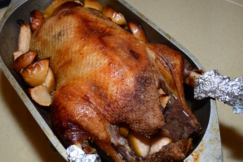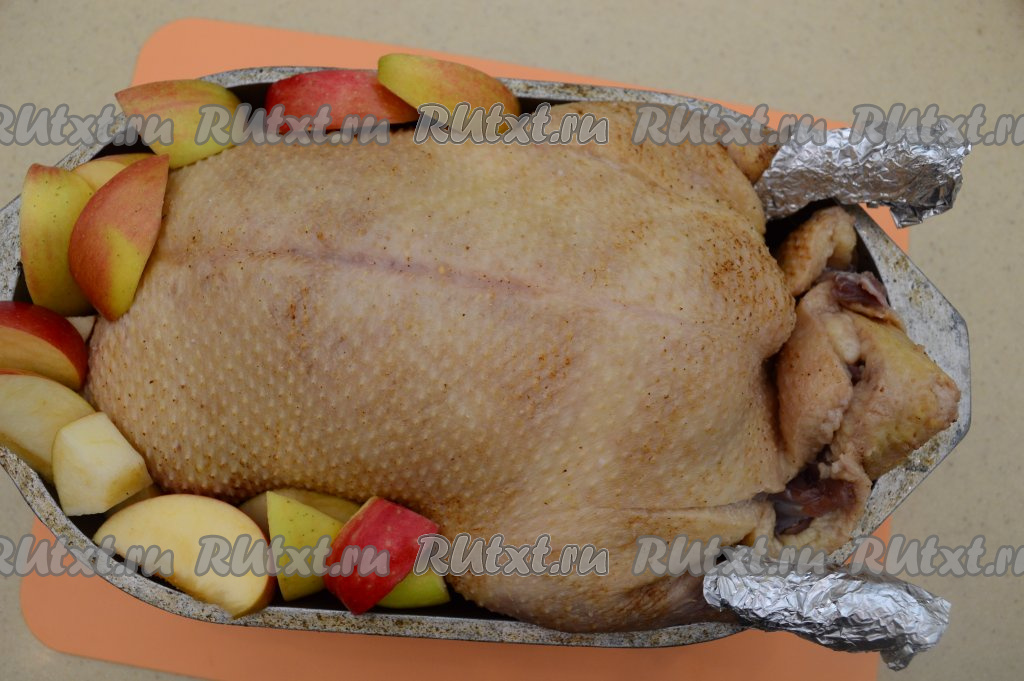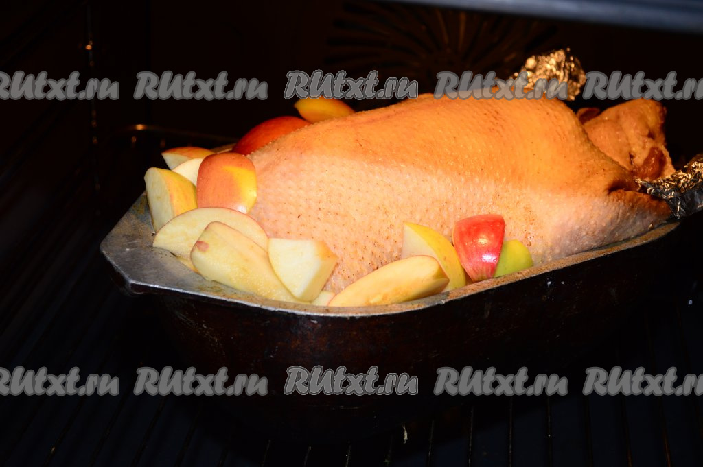 Поместить нафаршированную утку в утятницу, с боков утятницы расположить оставшиеся кусочки яблок. Ножки утки можно обернуть фольгой.