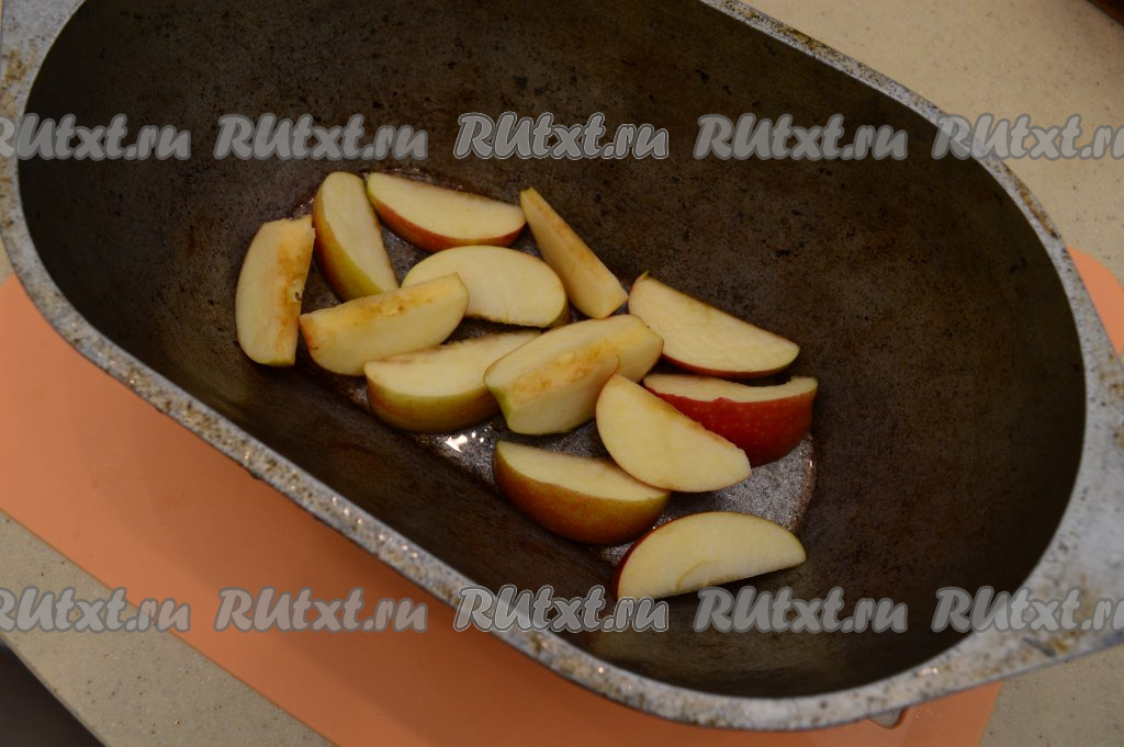 Нарезать яблоки на дольки, часть долек выложить на дно утятницы. Так как утка у нас будет лежать на яблоках, то саму утятницу можно не смазывать никаким жиром.