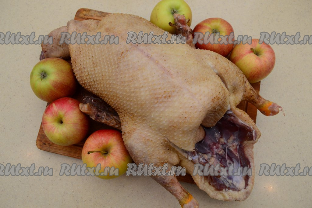 Брюшко утки заполнить кусочками яблок. Я брюшко с начинкой просто прикрыла сверху кожей, но можно скрепить разрез зубочистками.