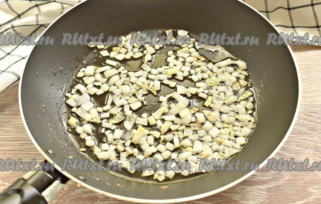 В сковороде прогреваем растительное масло и выкладываем нарезанный лук, обжариваем его на среднем огне до лёгкой золотистости (примерно, 2-3 минуты).