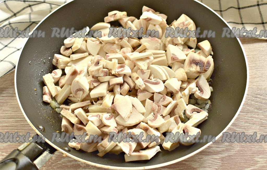 Промытые свежие шампиньоны нарезаем на достаточно тонкие небольшие кусочки, выкладываем к зазолотившемуся луку и обжариваем, периодически перемешивая, минут 6-7.