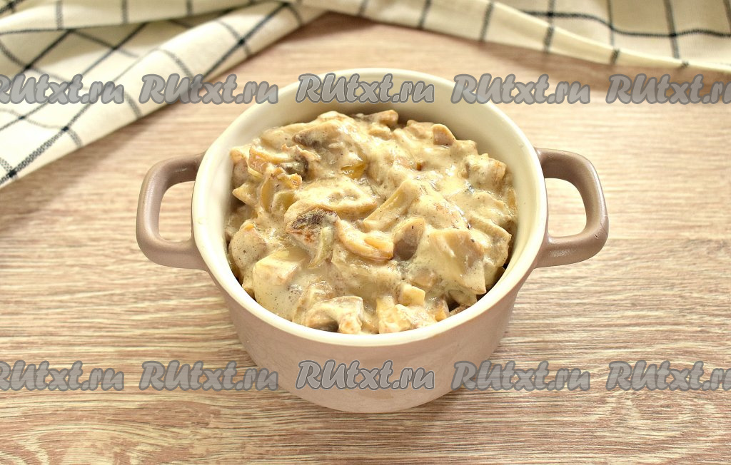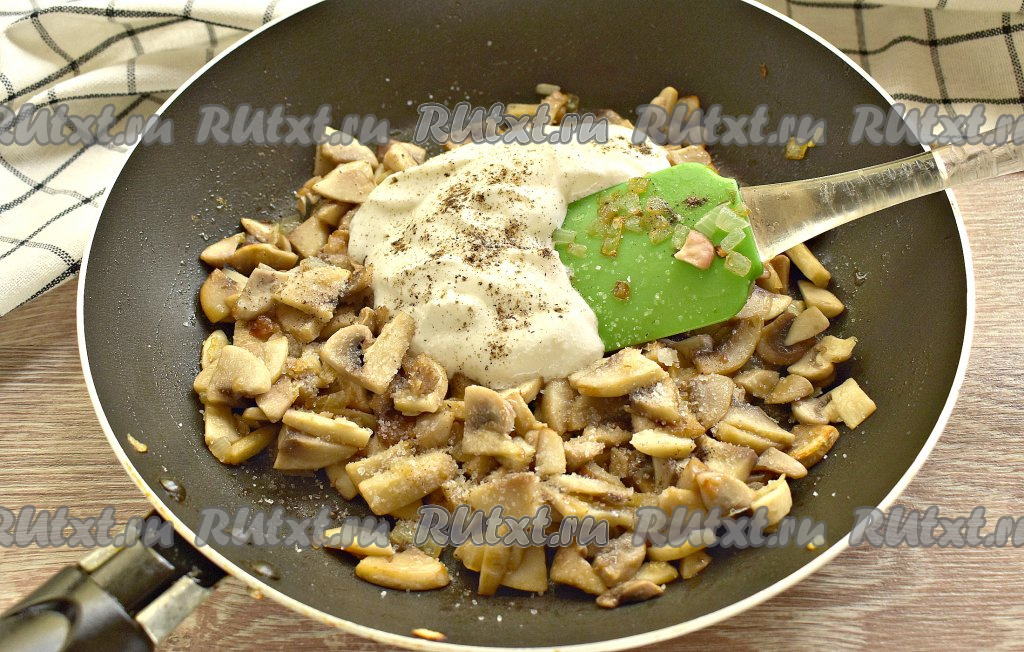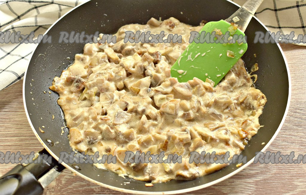 Тушим грибы в сметане на небольшом огне, иногда перемешивая, минут 5. Параллельно включаем духовку и выставляем температурный режим на 180 градусов.