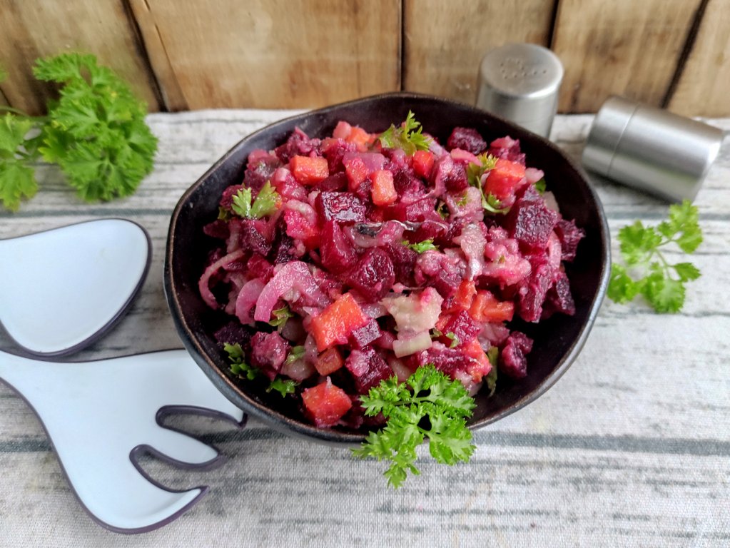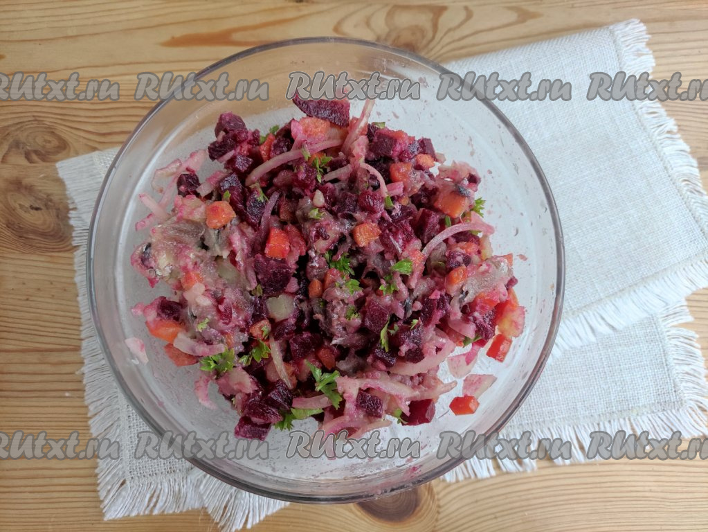 Винегрет перемешать, подсолить по вкусу и оставить при комнатной температуре на 5-10 минут.
