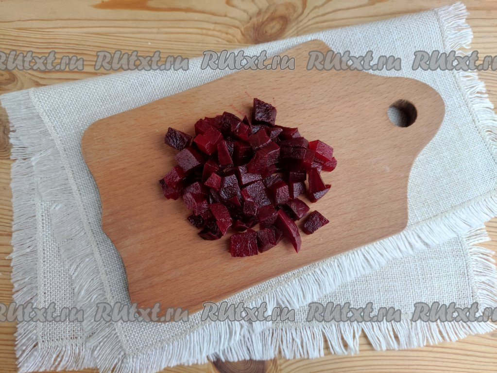 Свеклу в винегрет будем добавлять последней. Очистить её от кожуры и нарезать на кубики такого же размера, как нарезали картошины и морковь.