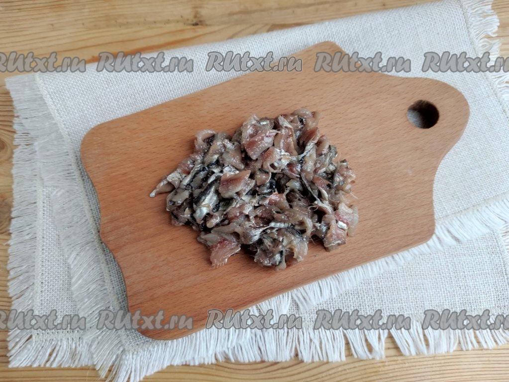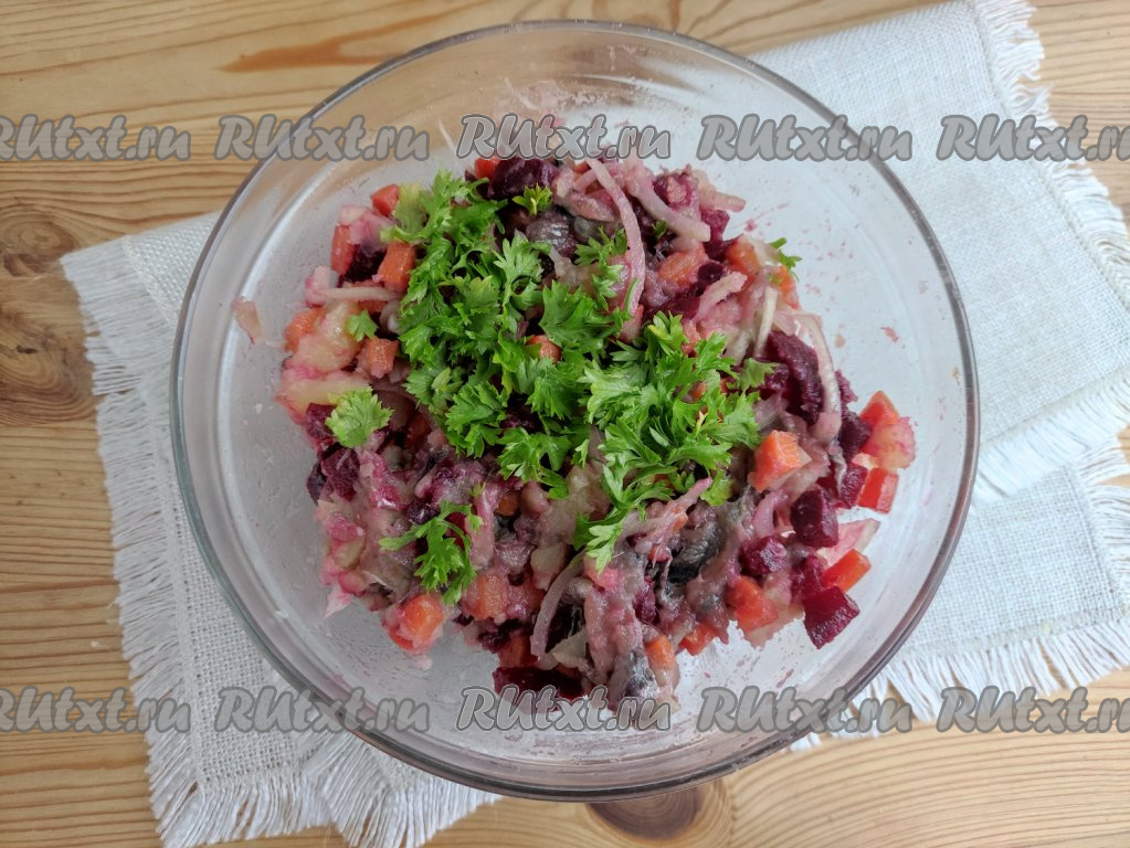 Свеклу выложить в миску с нарезанными овощами и килькой, сюда же добавить мелко нарезанную петрушку.