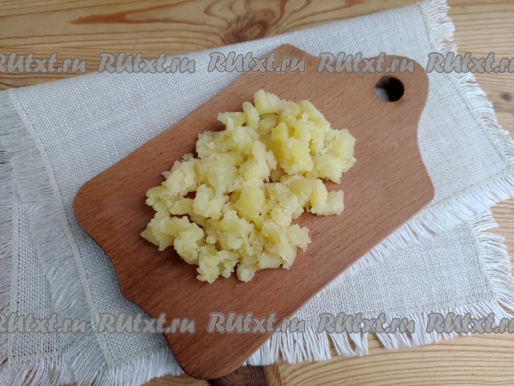 С отварного картофеля удалить шкурку, а затем нарезать на кубики такого же размера, как нарезали и морковку.
