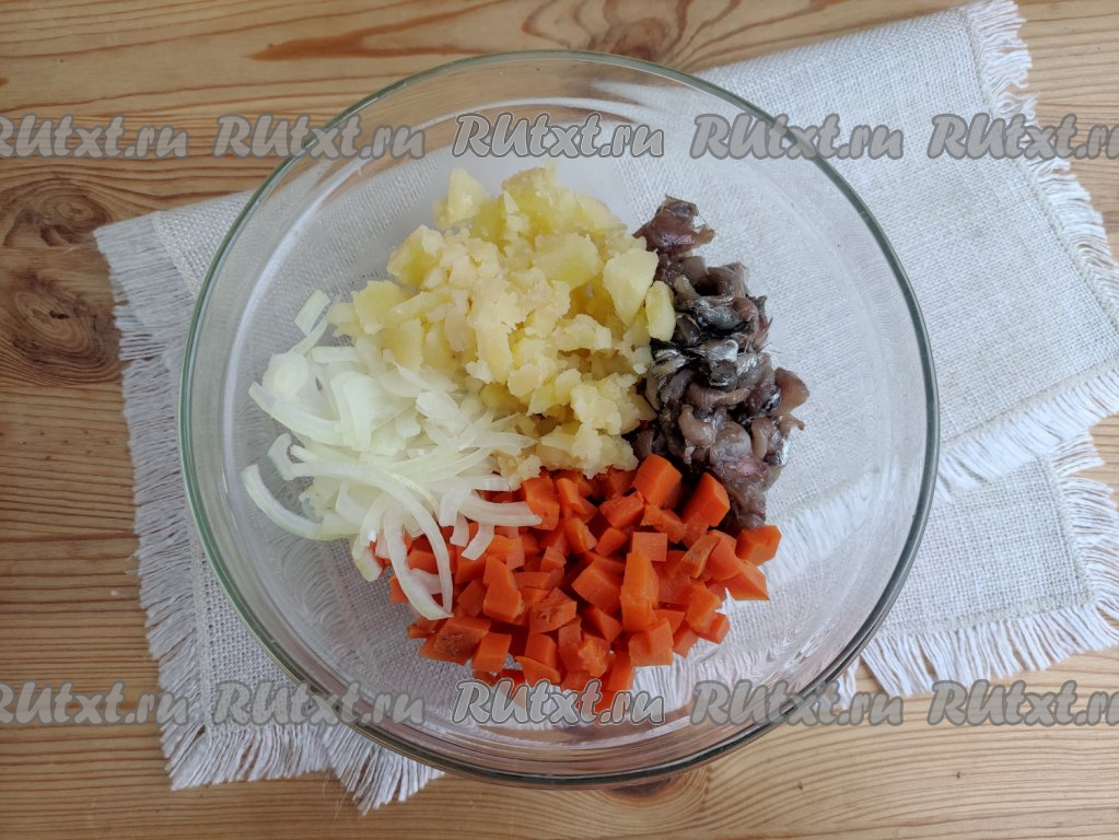 Подготовленные морковь, картошку, лук и кильку выложить в миску и перемешать.