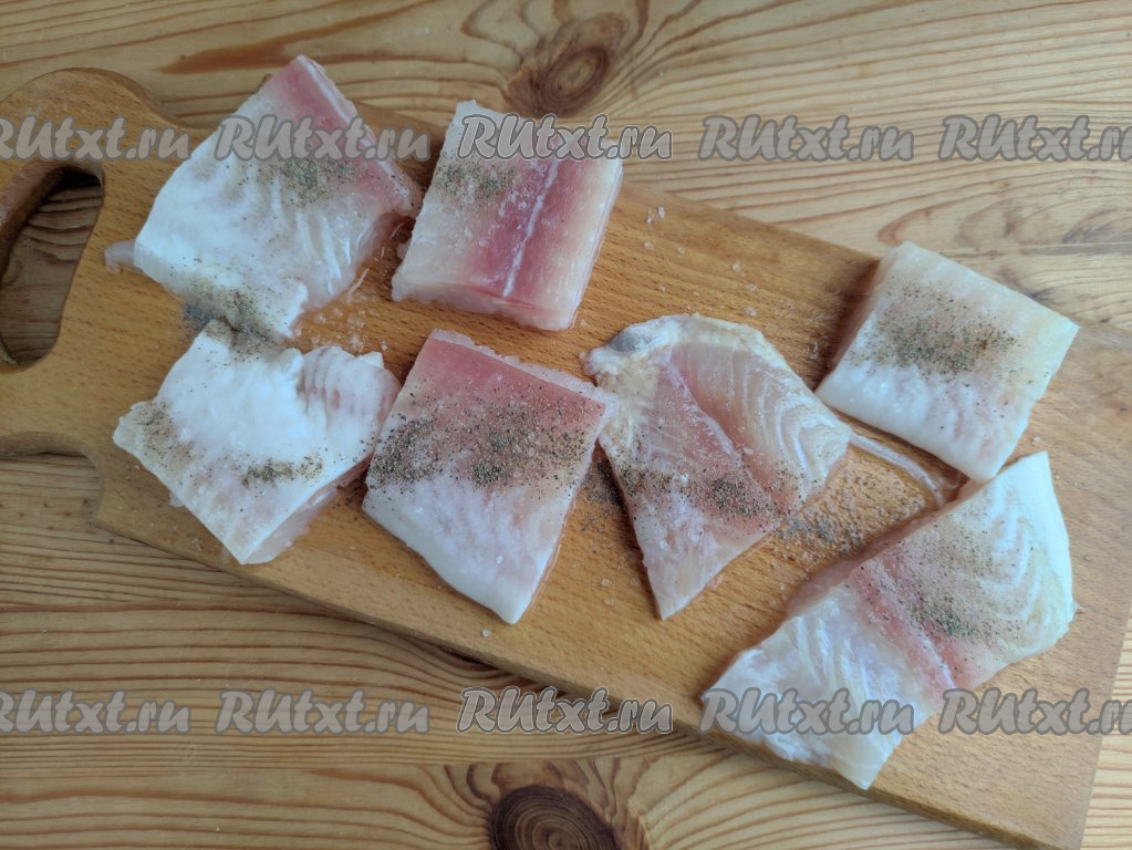 Филе рыбы нарезать на небольшие порционные кусочки, посолить и поперчить.