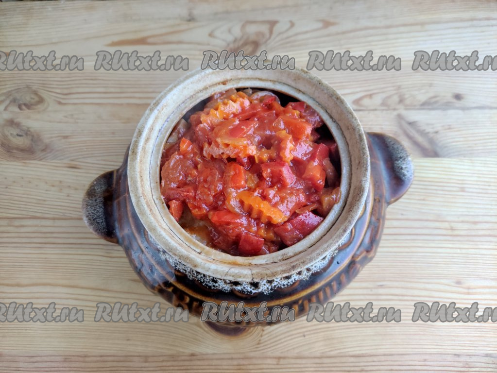 Сверху выложить тушёные овощи со сковороды, влить 120 мл горячей воды из чайника. Вода не должна быть выше половины уровня горшочка. Накрыть горшочек крышкой, отправить в разогретую духовку и готовить рыбу с овощами в течение 50 минут при температуре 190 градусов.