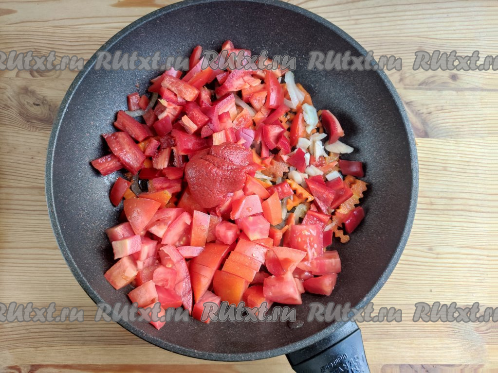 Болгарский перец очистить от семян. Помидор, по желанию, можно очистить от кожуры. Зубчик чеснока тоже очистить. Помидор, болгарский перец и чеснок мелко нарезать и вместе с томатной пастой выложить на сковороду с обжаренными морковкой и луком, перемешать, тушить овощи в течение 3 минут под крышкой на минимальном огне, посолить их по вкусу, добавить паприку и поперчить.