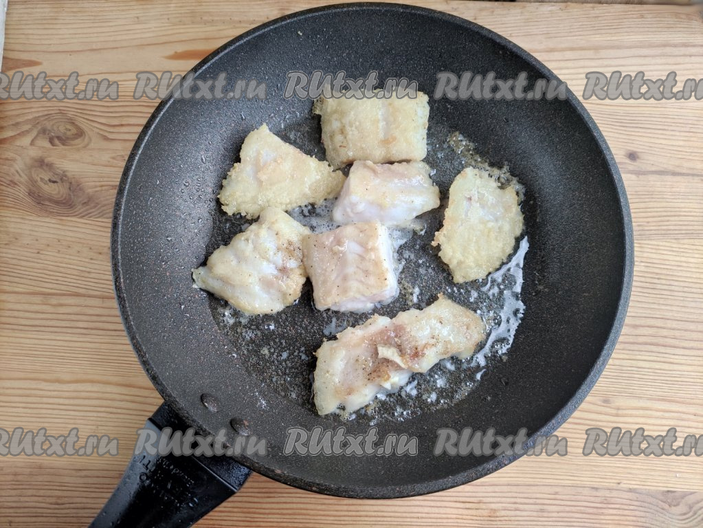 Каждый кусочек рыбы обвалять со всех сторон в крахмале (или в муке). На сковороде разогреть растительное масло и выложить кусочки рыбки. Обжарить рыбу с двух сторон на среднем огне до лёгкой румяности (примерно, по 2-3 минуты с каждой стороны).