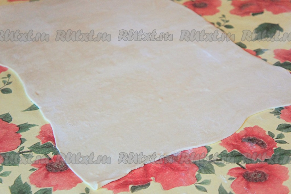 Слоёное тесто размораживаем. На столе, припылённом мукой, раскатываем тесто в прямоугольник толщиной 3-5 мм.