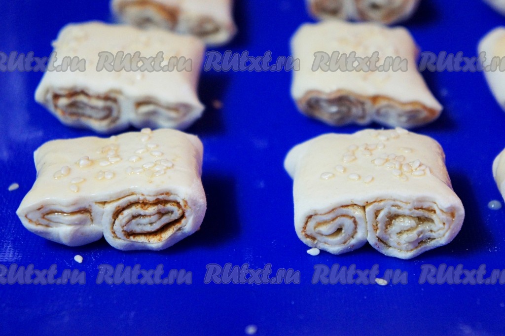 Духовку разогреваем до 200 градусов. Подготовленные слойки с сахаром и корицей выкладываем на силиконовый коврик (или на пергамент), смазываем верх слоечек оставшимся взбитым яйцом и, по желанию, посыпаем кунжутом. Выпекаем слойки в течение 20 минут (до золотистой корочки).