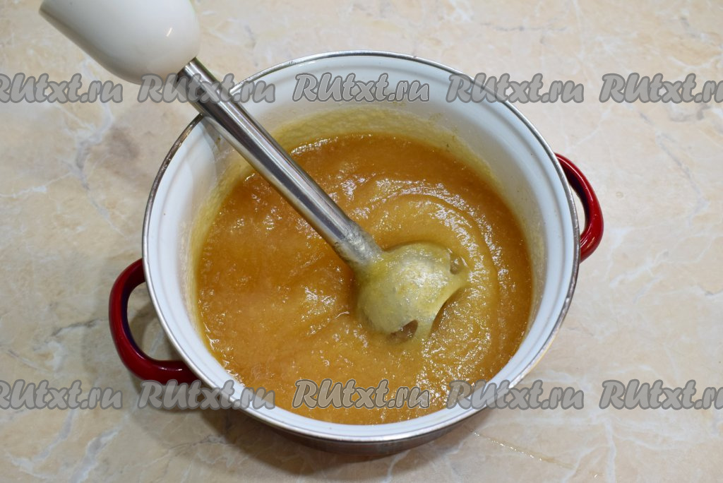 Измельчите яблоки с помощью блендера в пюре. Если любите, чтобы в повидле попадались небольшие кусочки, то этот шаг можно пропустить. Яблочное повидло, пропущенное через блендер, доведите до кипения.