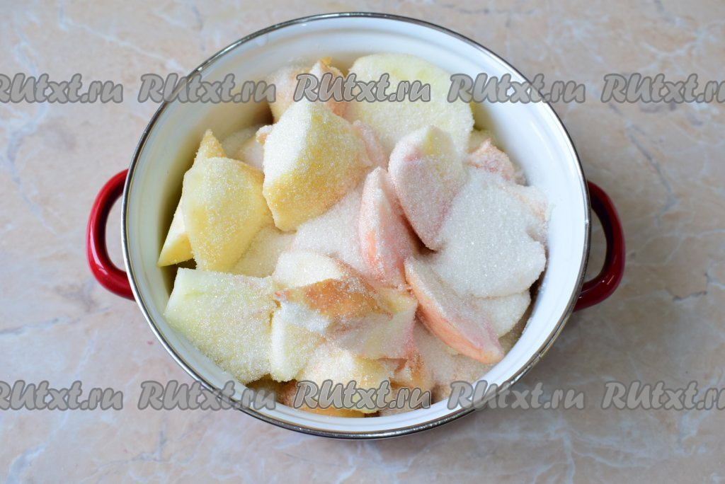Засыпьте яблоки сахаром и потрясите, чтобы сахар просыпался между яблоками. Оставьте яблоки в сахаре, прикрыв крышкой, на несколько часов, чтобы они пустили сок. Я обычно оставляю их на ночь.
